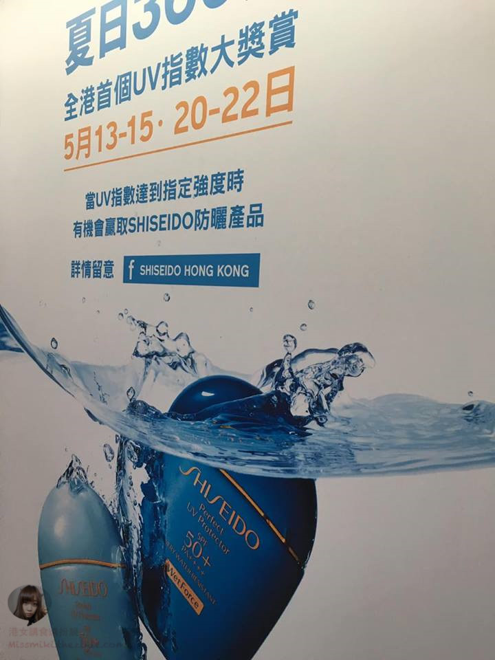 手持 SHISEIDO 的 POP,即場影張自拍,並上載 facebook,別忘了 hashtag #shiseidoHK #Suncare360 #WetForc
