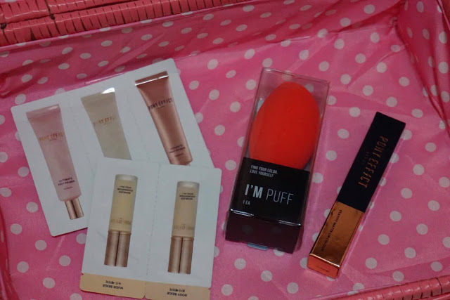 當中包括PONY EFFECT的粉底液及底霜試用裝、I’M MEME眼線筆和粉底海綿樸、及超可愛的貓耳髮帶。