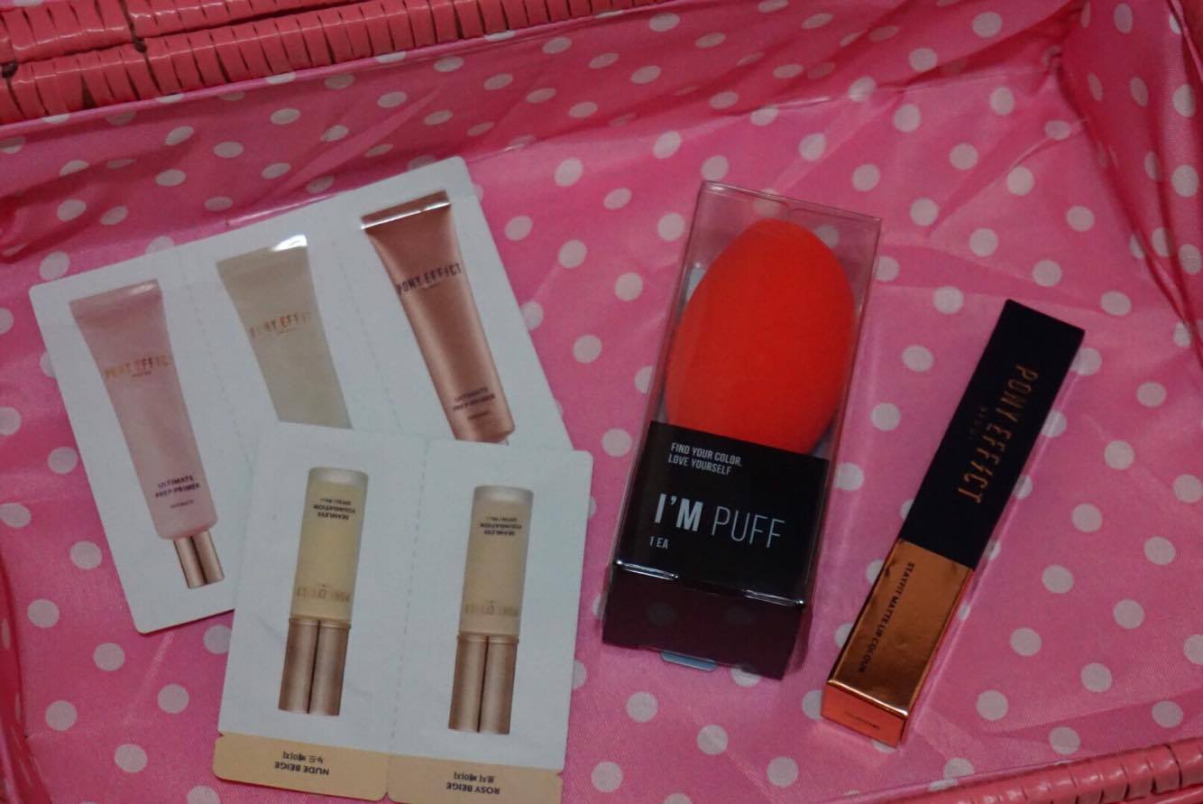 當中包括PONY EFFECT的粉底液及底霜試用裝、I’M MEME眼線筆和粉底海綿樸、及超可愛的貓耳髮帶。