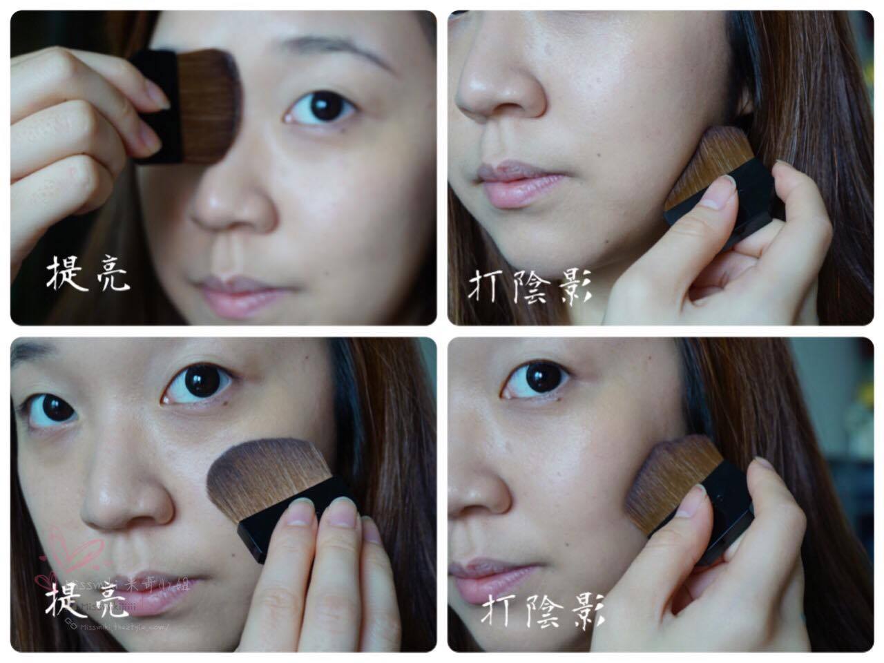 光影: 用化粧掃沾取(1)和(2)兩色,並塗於顴骨、額頭、鼻樑及下巴位置。