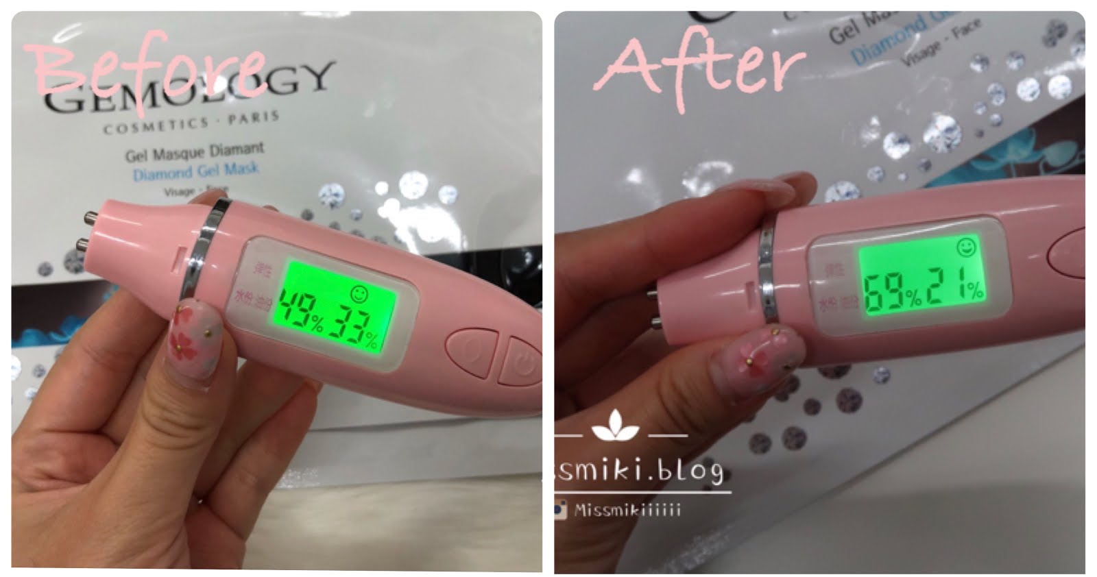使用後肌膚水分值提高到69%,油分值為:21%,