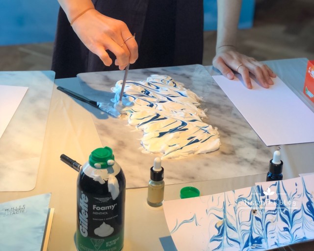 這次導師教我們利用剃鬚膏和顏料製作雲石染畫,